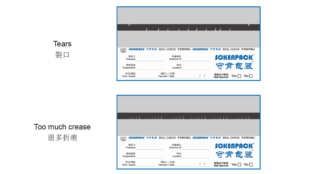密封檢查表的下半部分允許您記錄有關密封的數(shù)據(jù)(序列號機器、密封溫度、密封壓力、密封速度、操作員、日期、位置等)。